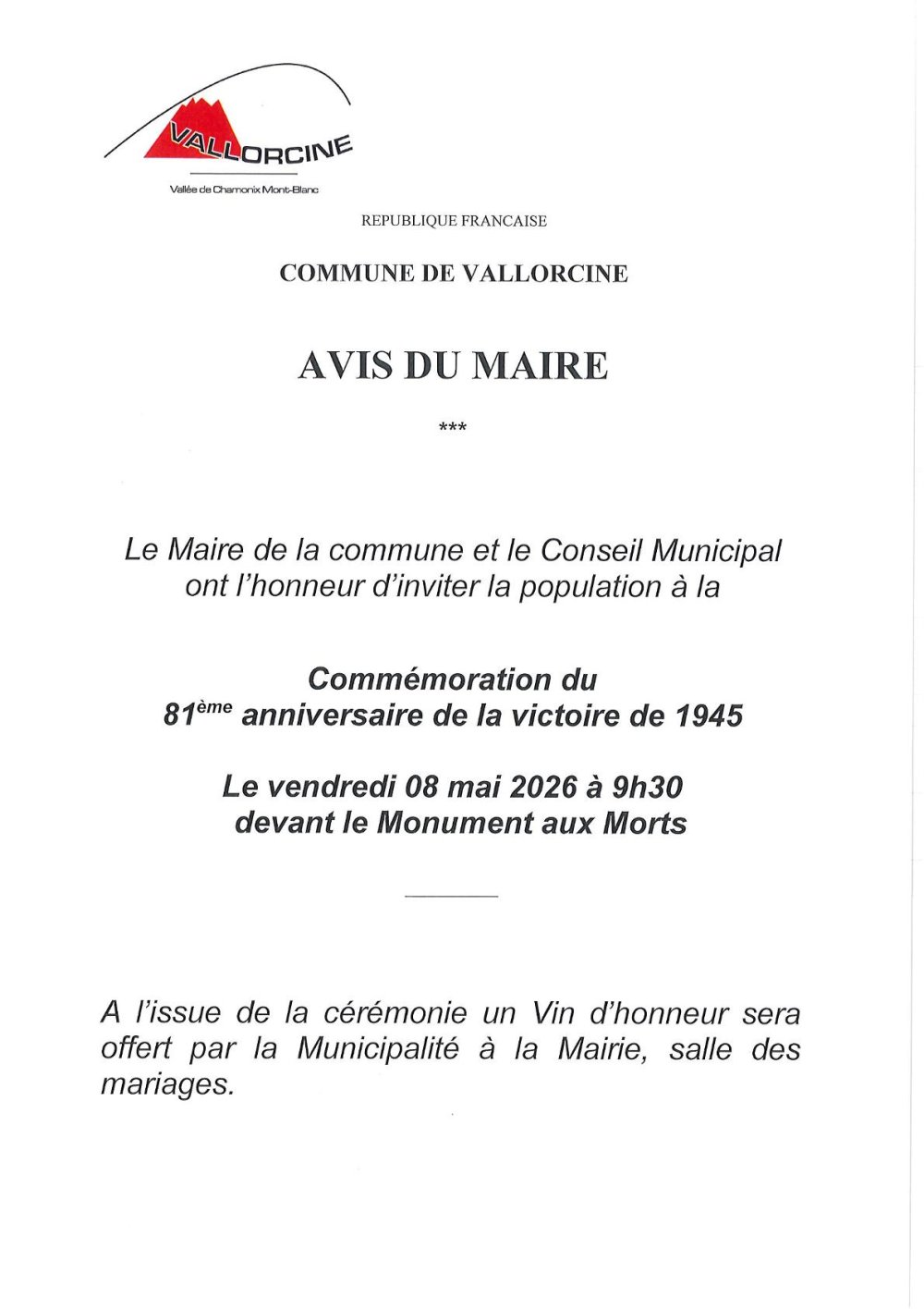 Vous êtes ici : Accueil > Actualités > Commémoration du 8 mai Commémoration du 8 mai Avis du Maire Publié : 28 avril 2026