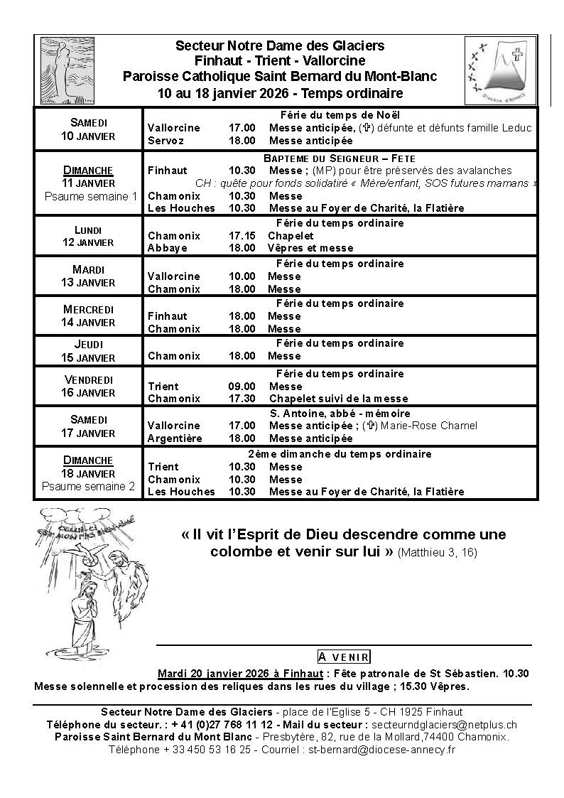 - Paroisse de St Bernard du Mont Blanc regroupant les communautés de Servoz, les Houches, Chamonix, Argentière et Vallorcine :