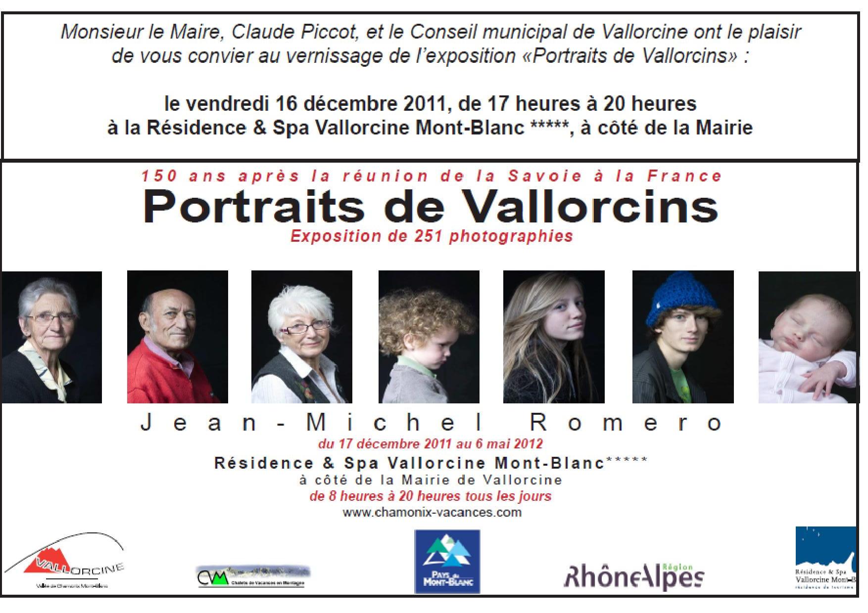 Monsieur le Maire, Claude Piccot et le Conseil municipal ont le plaisir de vous convier au vernissage de l’exposition "Portraits de Vallorcins" le vendredi 16 décembre de 17h à 20h à la Résidence & Spa Vallorcine Mont-Blanc*****