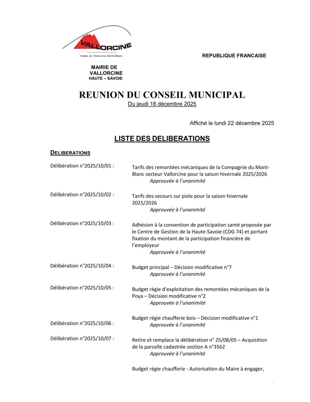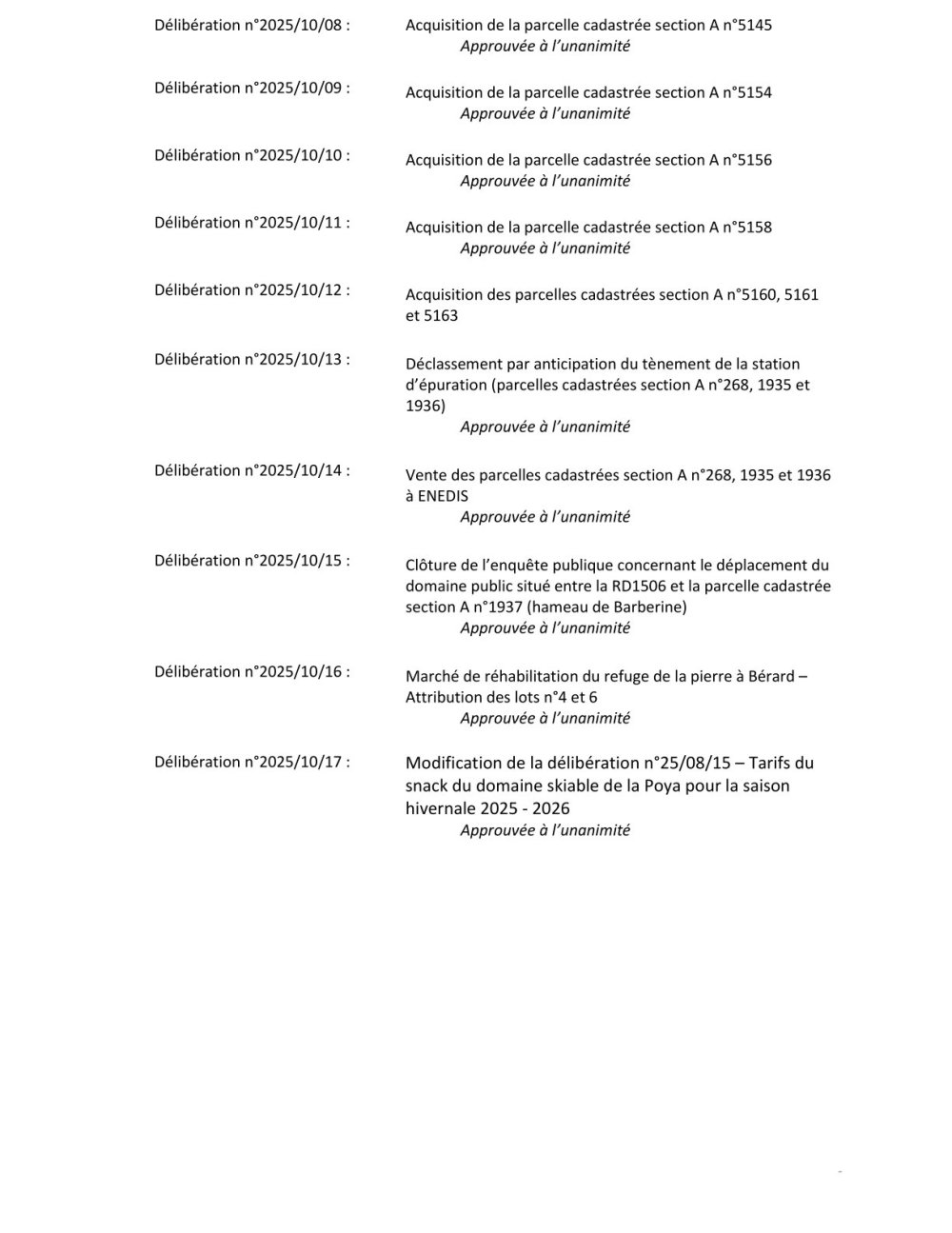 Vous êtes ici : Accueil > Municipalité > Délibérations, ordre du jour conseil municipal, arrêtés, informations > Conseils Municipaux > Conseils Municipaux 2025 > Conseil Municipal du 18 décembre 2025 > Liste des délibérations