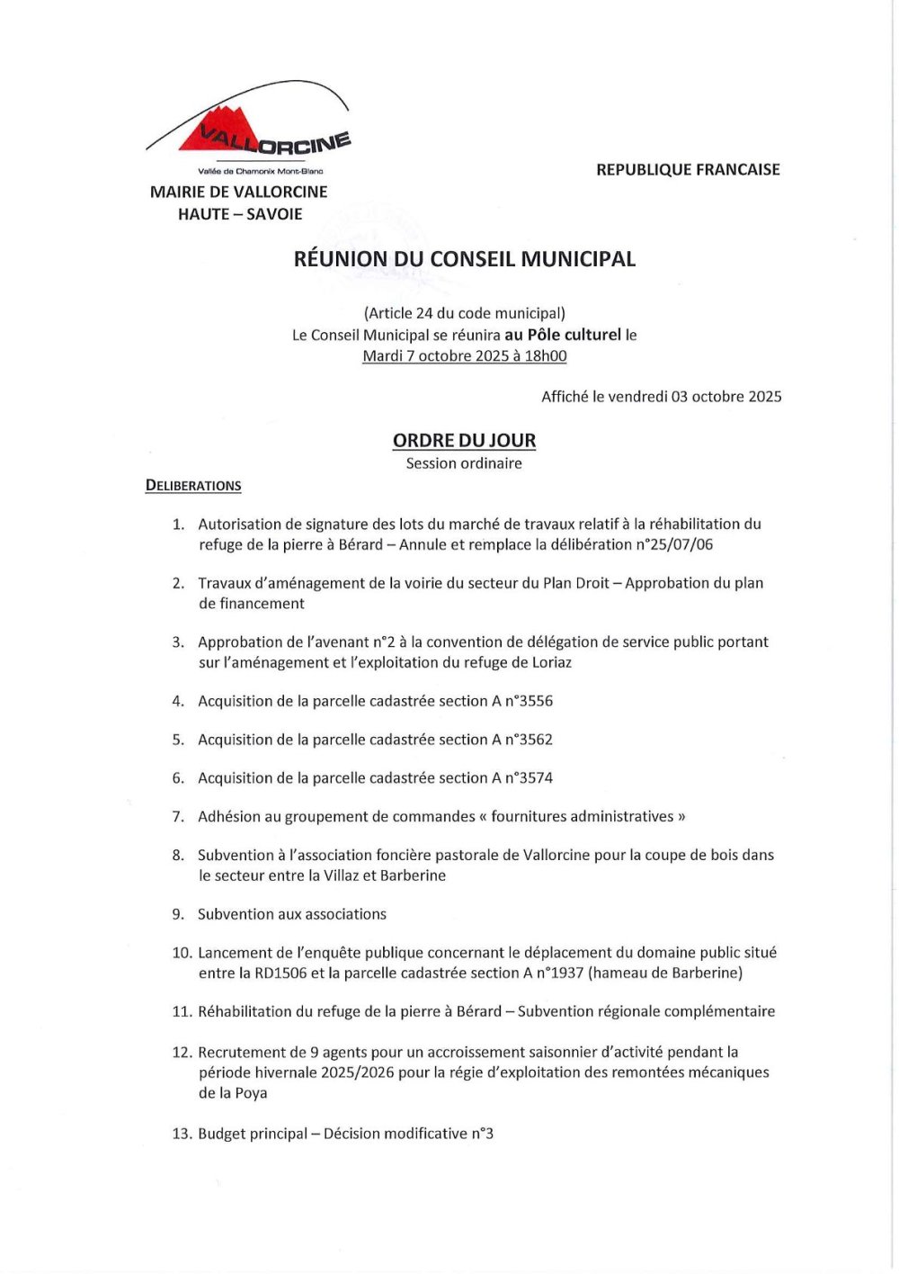 Vous êtes ici : Accueil > Municipalité > Délibérations, ordre du jour conseil municipal, arrêtés, informations > Conseils Municipaux > Conseils Municipaux 2025 > Conseil Municipal du 7 octobre 2025 > Ordre du jour