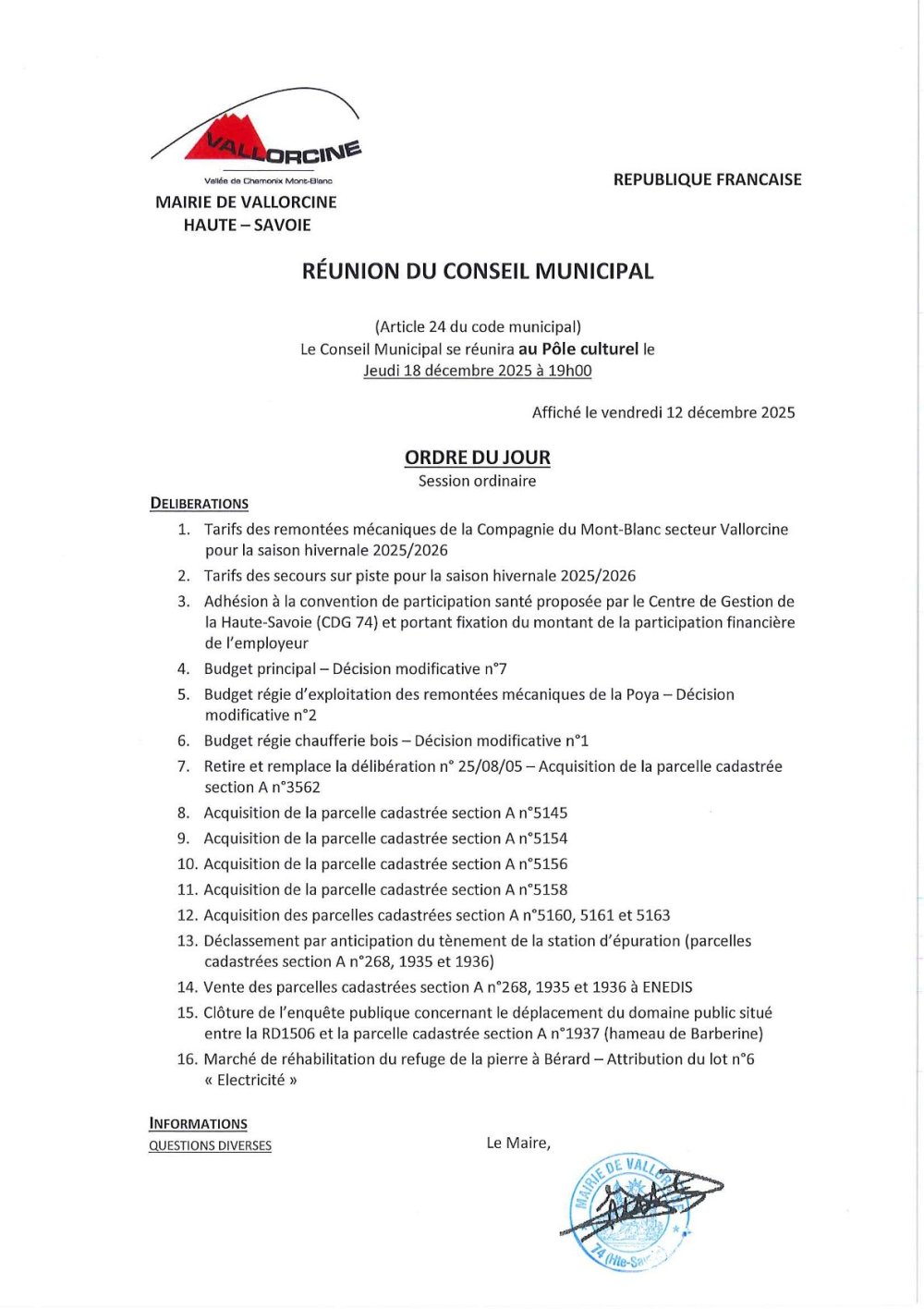 Vous êtes ici : Accueil > Municipalité > Délibérations, ordre du jour conseil municipal, arrêtés, informations > Conseils Municipaux > Conseils Municipaux 2025 > Conseil Municipal du 18 décembre 2025 > Ordre du jour