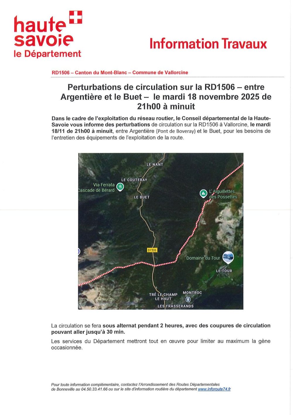 Vous êtes ici : Accueil > Actualités > Perturbation circulation RD1506 - Mardi 18 novembre 2025 de 21h00 à minuit entre Argentière et Le Buet