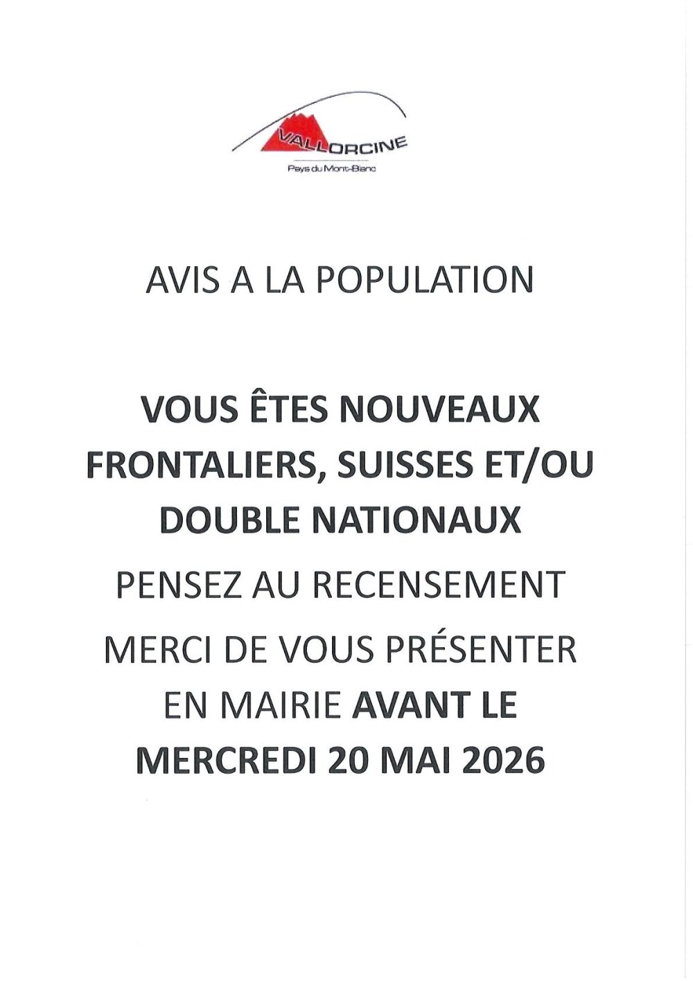 Vous êtes ici : Accueil > Actualités > RECENSEMENT FRONTALIER RECENSEMENT FRONTALIER AVIS A LA POPULATION Publié : 27 avril 2026